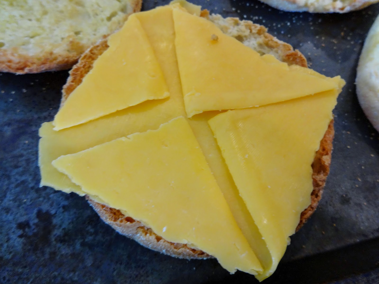 Once the English muffins are finished, put your cheese slices on them. I fold the corners of my cheese up, because its neater, but if you're not worried about that, certainly feel free to let them hang over the edges. Then layer on the bacon, and egg, and put the other half of the English muffin on top! Voila!